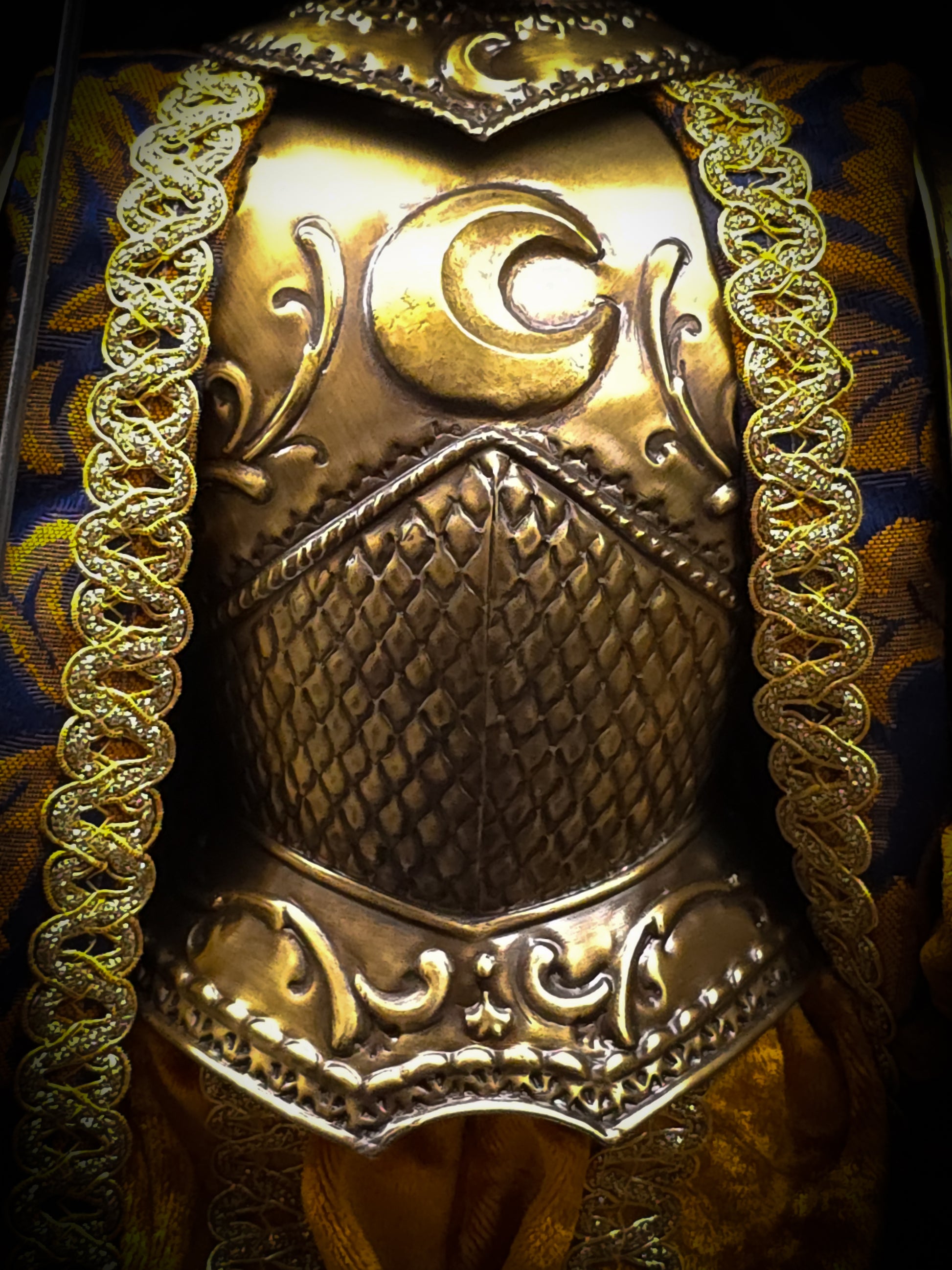 Pupo siciliano altezza 55 cm, armatura in ottone brunito lavorato a sbalzo e cesello.